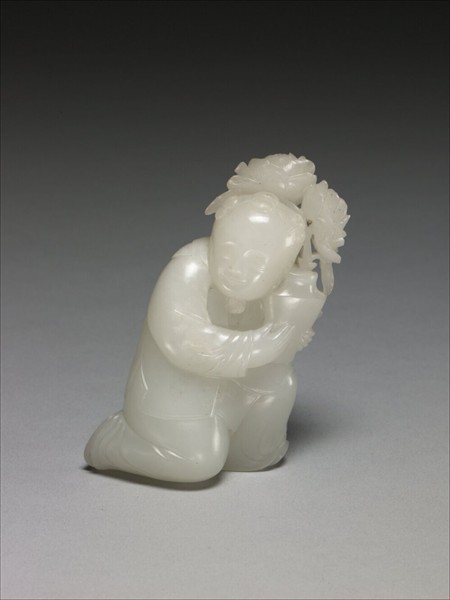 玉質,立雕童子單膝跪地,於頭部右側持捧插有二枝月季花的歛腹瓶,以陰線刻方式表現童子之面目表情,衣著樣式。童子頭梳三髻,頸部繫有一巾,繞至背部繫蝴蝶結。