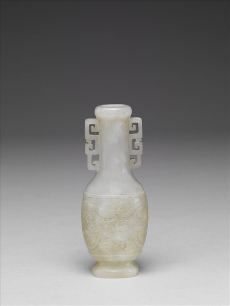 玉質,沁有褐色斑,橢圓形,唇口,長頸,雙拐子龍紋耳,斜肩,歛腹,圈足。以立雕刻出器型及雙耳,腹部以淺浮雕及陰線刻製作對鳳紋圖案。