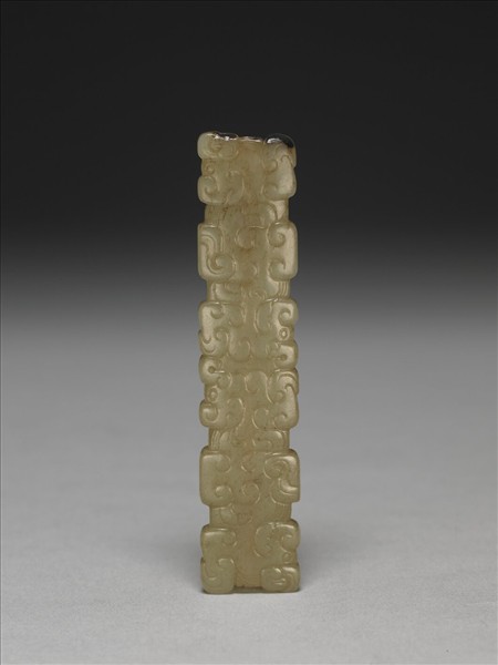 扁平長方形玉,有褐斑。以四隻側面龍獸組成,器身中央有一貫通中孔。
