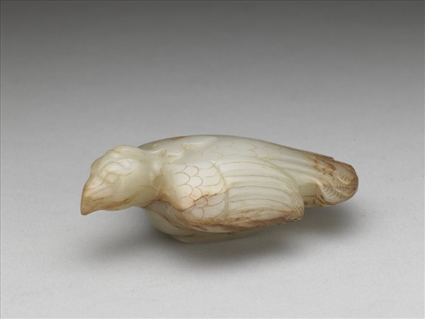 白玉沁褐。圓雕鳩鳥外形、頭部輪廓,再淺浮雕出冠羽、翅羽及腳部,並以陰線刻刻出眼睛、身上的羽紋及細部修飾。鳩鳥身形各部區分明顯,前圓後扁,身體部分較寬厚。