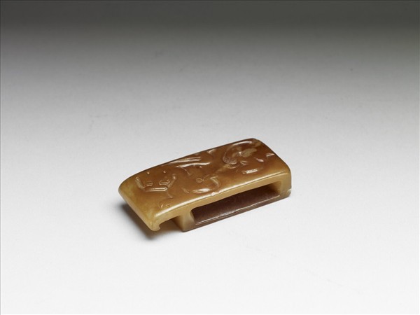 玉劍璏,帶白斑,表面陰刻一獸紋。帶木匣及木座,有黃籤「六百七十三號」。與故玉004182、故畫003812同置於漆盒內。