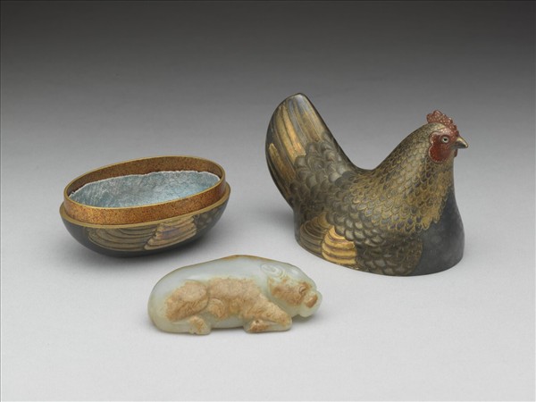 玉質,局部沁染成淺褐色。獸呈跪俯姿態。 置於清代母雞造型的蒔繪漆盒。