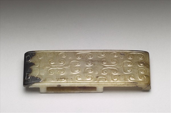 本器為劍璏,玉質,有褐黑色沁,拋光細緻,溫潤光亮。正面上端有一獸面,獸眼及雙眉明顯,自獸面下方以相同的紋飾單元重複鋪列器身,勾勒出簡化獸身背脊,為西漢中期至東漢常見的紋飾模組。側面有呈矩形的貫穿方孔,孔內側遺留線具拉切去料所形成之平行線痕,為漢代玉器製作常用技巧。從紋飾題材風格、形制、玉質特徵與雕刻技巧來看,屬漢代作品。本器存放在院藏「紫檀雕蟠龍方盒百什件」(故雜877)中。