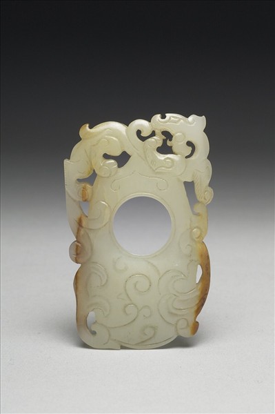 本器為韘形佩,玉質,有黃色沁染。器表雕神獸和淺浮雕雲氣,獸眼與明晚期古籍所繪的獸眼相仿。韘形佩雖為漢代流行的玉器品項,但本器神獸紋飾雕琢不若漢代生動。從神獸鏤空技巧,及勾勒足尾的輪廓來看,屬後期仿漢作品,加上染色方式,可知應屬明晚期至清早期作品。本器存放在院藏「紫檀雕蟠龍方盒百什件」(故雜877)中。