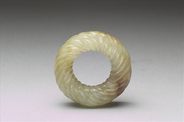 本器為環形器,玉質,有黃斑,帶褐色沁,器壁作扭絲紋。此類扭絲紋環常見於春秋晚期到西漢,但考古所見的形制和紋飾較為規整精確,本器扭絲紋不流暢,環徑大小不一致,推測應屬明代仿古作品。本器存放在院藏「紫檀雕蟠龍方盒百什件」(故雜877)中。