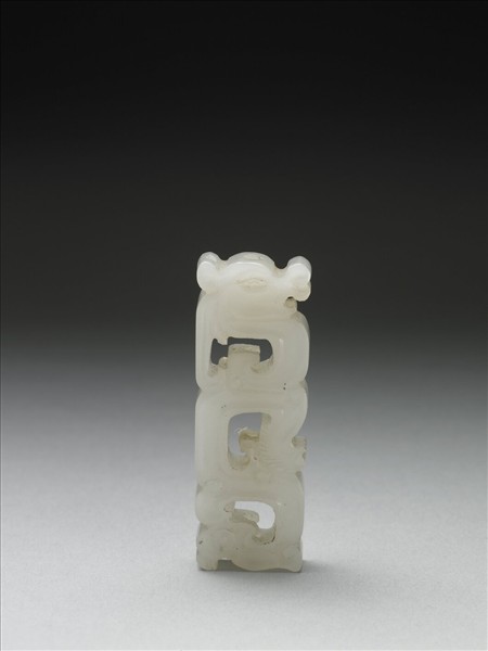 本器為長方形佩,玉質,上下兩端各雕一龍鳳,共用中段。從玉質純淨、龍鳳身形幾何規整的特徵來看,屬清代作品。本器收納於小方盒,再與玉對鳥佩(故玉4362)與玉如意雲紋佩(故玉4363)共貯於花卉蒔繪小漆盒(故漆400),存放在院藏「紫檀雕蟠龍方盒百什件」(故雜877)中。