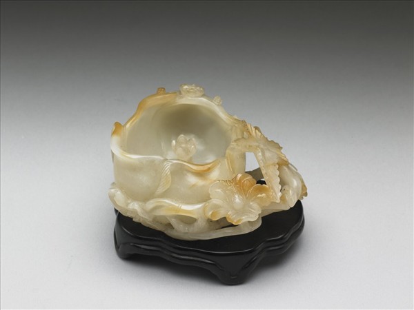 本器為水盛,玉質,局部帶糖色沁。器身浮雕螭虎和花葉,中間雕一蕊柱,兩前足等高對稱攀附口沿,兩後足一直伸一內縮,此為明代螭虎特徵。螭虎與花卉植物組合,也常見於明代文房用具的設計。本器帶紫檀木座,存放在院藏「紫檀雕蟠龍方盒百什件」(故雜877)中。