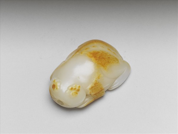 玉雕蟾蜍,眼睛與通體利用黃玉皮巧色,雕工流暢,並以蟾蜍口為壺口。原貯於華滋堂燕喜堂中,共41個鼻煙壺貯於一楠木箱。