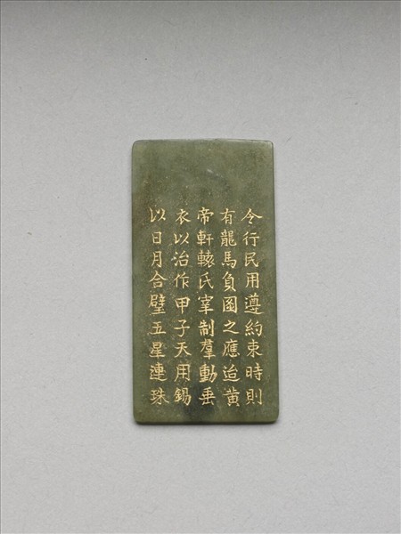 乾隆《御製九符》玉冊,內文由張若藹(1713-1746)書小楷,共二十四片填金青玉冊,是多寶格中所盛裝的一件文玩。故玉4391至故玉4414為一整組,故玉4390為此套《御製九符》玉冊的容器。