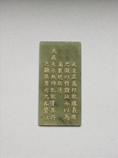 乾隆《御製九符》玉冊,內文由張若藹(1713-1746)書小楷,共二十四片填金青玉冊,是多寶格中所盛裝的一件文玩。故玉4391至故玉4414為一整組,故玉4390為此套《御製九符》玉冊的容器。