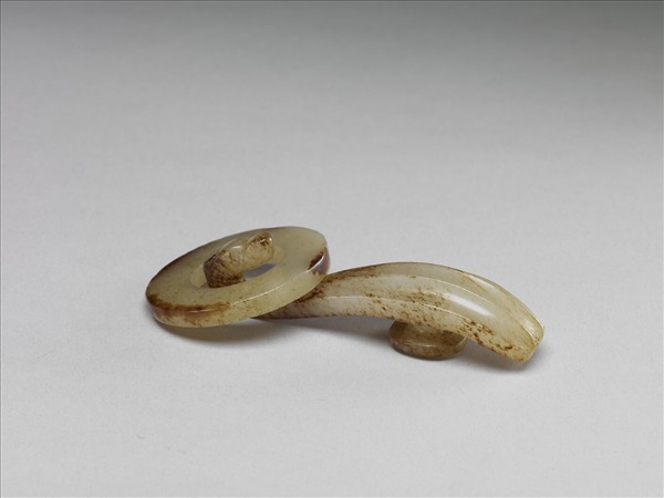 玉雜赭斑,分為不相接連的兩部分,一為新石器時期的環形器,一雕成西漢時期的玉帶鉤。其玉帶鉤端點略雕為獸首,可扣於環形器上。另端作弧形拱起,背面有圓柱鈕,其作用是固定於革帶之上。