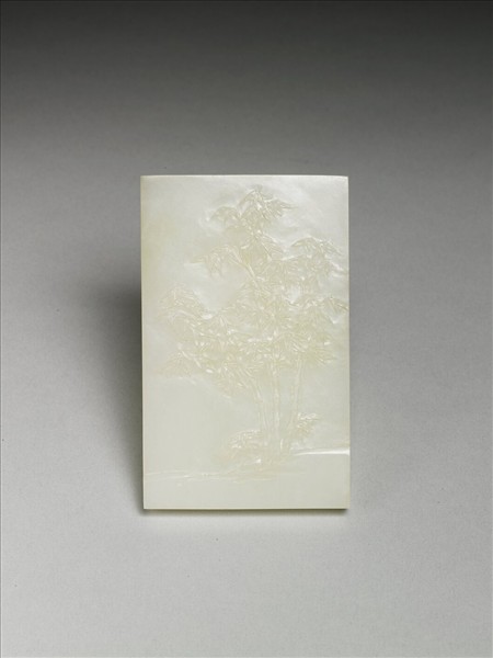 玉版,一面淺浮雕竹子三竿,葉甚茂密。另面則雕清高宗古希詞填金楷字,表達對生死的態度與其為政的期許,末有「會心不遠」、「德充符」二印。本件與其他六件玉器、三件書畫同儲於漆盒中。