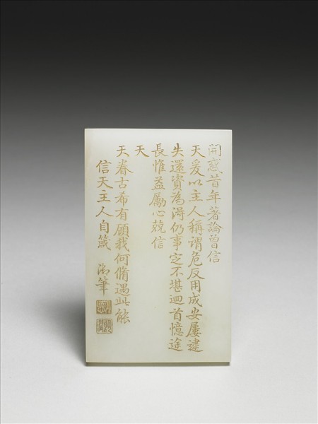 玉版,一面淺浮雕老梅一棵,其上梅花盛開,並刻意將梅花的比例放大。另面則雕楷字填金清高宗自作箴,來表達天眷及對自己的期許,末有「比德」、「朗潤」二印。本件與其他六件玉器、三件書畫同儲於漆盒中。