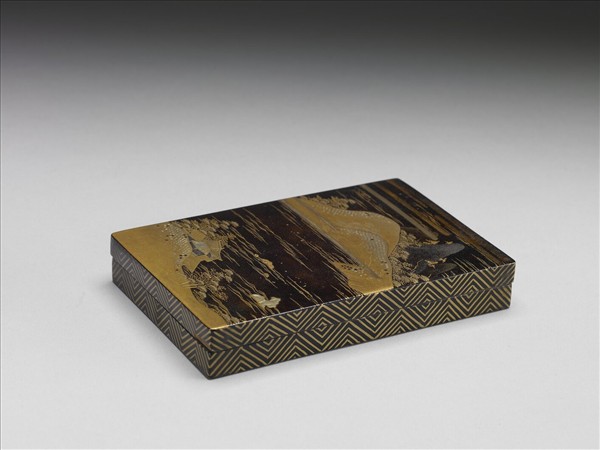 原置菊籬螺鈿蒔繪三層屜盒的中層屜內,與故玉4444N1、故玉4445N1共組成一幅蒔繪山水。盒內置玉版,版兩面分別淺浮雕松及乾隆皇帝御筆。盒面黑漆地高蒔繪大江及江邊山丘樓閣,以近景中景為主,遠山以蒔暈表現,山坡切金,構圖猶如手卷,十分華麗。此器為日本作品。