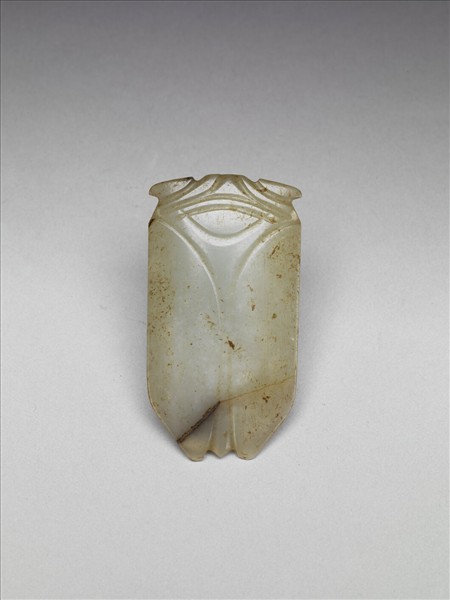 白色玉,兩旁帶褐色雜斑,下方有一褐色絲沁。器薄,全器雕成一蟬之形狀。造型幾何化,頂有一牛鼻穿。此類玉蟬常作為「琀」,放置於死者嘴內。因頂部之穿可懸繩,亦可做為配飾用。故雜3105,底座有「六百七十二號」,本件置於故雜1024盒內。
