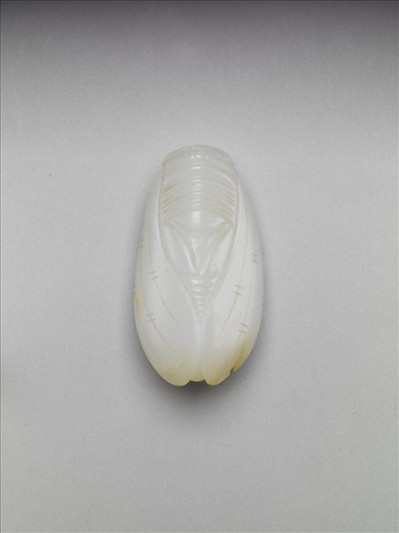 白色玉,兩旁帶褐色雜斑,下方有一褐色絲沁。器薄,雕琢成一蟬之形狀。造型幾何化,頂有一牛鼻穿。此類玉蟬常作為「琀」,放置於死者嘴內。附黃籤「六百六十一號」,「儲字三號」,本件置於故漆404盒內。