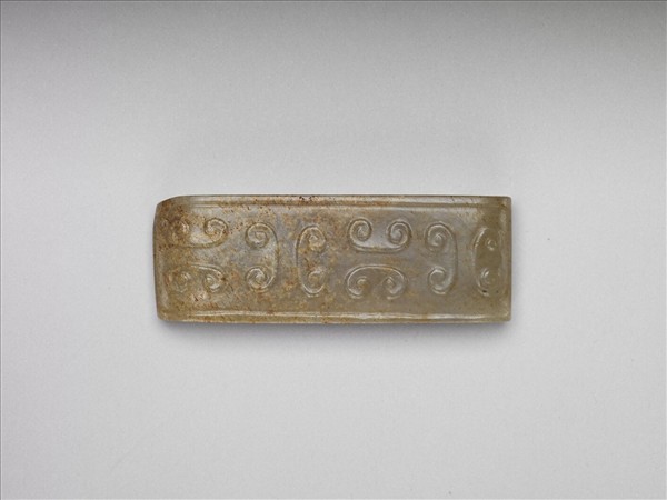 玉質,器表密佈白色與褐色雜斑。琢成一玉劍璏,表面於兩長邊各刻一道弦紋,中間琢幾何紋。黃籤「六百六十一號」,「儲字三號」,本件置於故漆404盒內