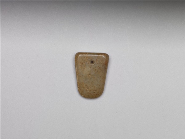 白色玉偏黃,密佈褐色斑。全器琢成一扁平玉片,兩側微斂,上端平直,下端呈圓弧形。玉之上端採雙面鑽孔技法,鑽一透空之圓孔。表面光素無紋。 黃籤「六百六十一號」,「儲字三號」,本件置於故漆404盒內。