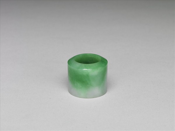 翠玉扳指,質地瑩潤,光素無紋。與玉扳指(故玉4464)、文寧書清仁宗《訓著闓抨》御製詩冊頁(故書1041)合為一組,共貯於錦座漆盒中。詩文與器物相互對應,傳達玉質扳指具有比德堅剛,傳承清代皇室重武衛疆精神的特殊意義。扳指或作搬指,原是射箭時,戴在拇指上便於拉弓扣弦的工具,源自先秦時期的韘形器,其後逐漸演變為具有裝飾功能的佩飾。清代皇室重視騎射,使用多種材質製作扳指用以佩帶使用,或玩賞收藏。清仁宗嘉慶皇帝御製〈咏玉韘詩〉謂:「射藝我朝重,屈支習自童。抨弓器宜韘,繞指氣如虹。比德材全具,主皮力不同。宣威首弧矢,靖逆揚皇風。」顯示滿族皇室歷來注重習武演兵,寄寓扳指武德宣威的象徵意義。