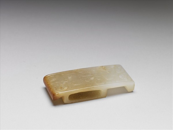 青白色玉,器半邊呈黃褐色,一端呈深棕色。琢成一長方形玉,背面中部凸起一扁方塊,其兩端設一小塊遮擋,扁方塊的橫向開有扁平之方孔,推測可能為玉劍璏。表面以陰刻技法於兩長邊各刻一道弦紋,中間一端琢獸首紋,餘地飾雲紋。