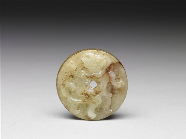 青白色玉,夾雜褐色斑紋。全器琢成一扁圓形玉,邊緣平整。玉中央由背面鑽一圓孔。玉正面由深浮雕技法琢一螭龍紋,玉之背面佈滿雲紋。推測此器可能為玉劍首,通常位於劍把端部。