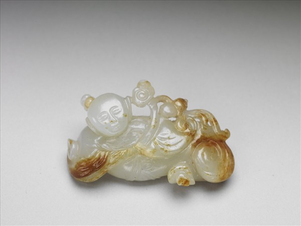微透明白玉,夾雜少許褐黃色斑。玉琢成一人物形狀,呈斜躺姿勢,笑容可掬。人物頭頂紮一髻,手持一株靈芝與數顆壽桃,取其「長壽」意涵。有黃籤「六百六十八號」,「儲字十號」,本件置於故雜1026盒內。