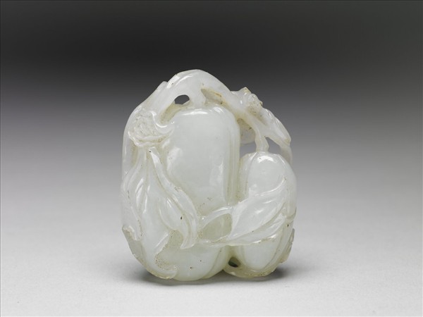 玉質,間雜黑色斑點。琢成一大一小兩顆相連之瓜果,瓜蒂上連接枝葉、藤蔓與花朵,皆纏繞披覆於瓜身上。