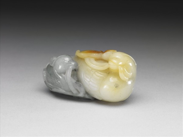 玉半邊為青白色夾雜黃斑,另半邊呈灰白色,夾雜黑色斑。依玉石顏色變化,分琢兩相連之鴛鴦,在底部蓮葉上呈俯臥姿勢而互相對望。兩鴛鴦口啣蓮葉,葉披覆身上。