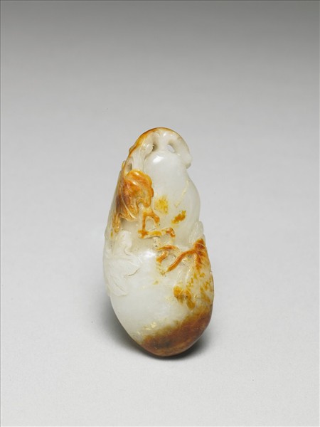 玉質,夾雜大片黃與紅色斑。琢成一直立之葫蘆,葫蘆之蒂突起,蒂上連接葉片與藤蔓,皆纏繞包覆於葫蘆周身。