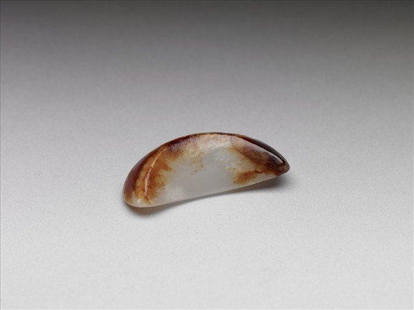 玉質,夾雜大片褐與紅色斑。琢成一不規則之彎月形玉塊,一面略平,另一面中段略厚,側邊薄。表面光素無紋。