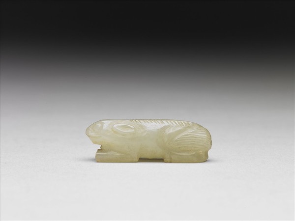 玉質,琢成一呈蹲踞姿勢之兔,兔體型狹長且兩側扁平,周身線條簡潔抽象,背上及後腳部分刻畫少許紋飾。