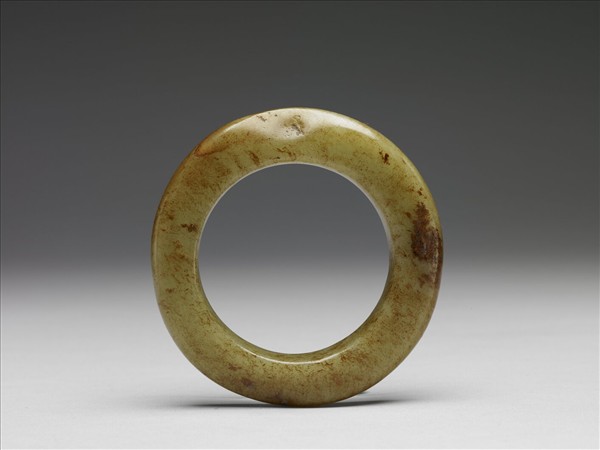 大汶口文化先民喜愛戴二種玉質腕飾。其一似圓筒,另一似玉璧。這件屬後者。先秦兩漢時,圓圈形玉器的器名紛雜,《爾雅》收錄:璧、環、瑗三種器名。目前學界主張將剖面呈長方形者統稱為璧,比例上孔大者稱為「大孔璧」。剖面近圓形者稱為「環」。此件大孔璧玉質很好,曾被染成褐色。外緣微作圓弧、孔壁平直的特徵,以及外徑、孔徑的尺寸,均相似於野店、壽光後胡營等大汶口文化遺址出土者。