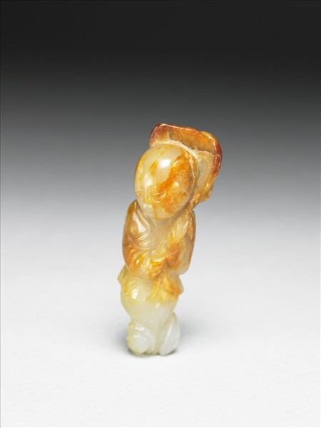 玉質,夾雜紅、黃色雜斑。琢成一直立之童子,身軀微向左側傾斜。雙腳一前一後交叉,右腳踮起。雙手持一蓮葉,蓮葉繞過左肩,棲於童子頭部後方。童子持蓮,取其「多子多孫」之吉祥意涵。本件與故玉4509、4511、故畫3816同置於故雜1031盒內。
