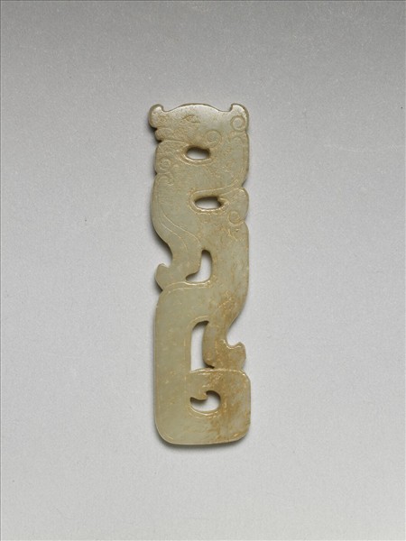 青綠色玉,夾雜褐斑。琢成一長方形扁平玉牌,為一龍形圖案。雙面以陰刻技法雕飾龍之細部圖案。