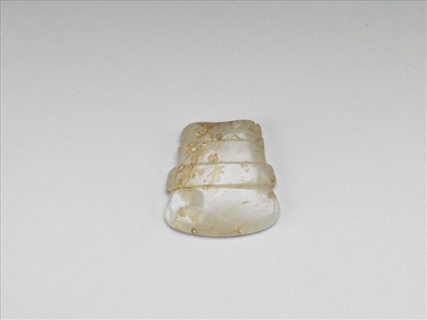 玉質,帶白與淺褐色雜斑。琢成一斧形玉塊,一面微隆,一面扁平。玉器中段有一突起寬帶,環繞玉身周圍,將全器分成上下兩段,上段較窄,中央鑿一雙面穿圓孔,旁邊陰刻幾何紋飾,可作為玉珮。玉之下半段較長。