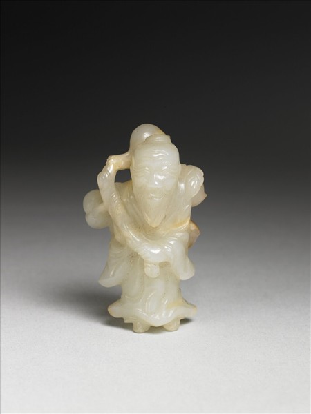 玉質,有赭斑。整器雕一老人之像,此人笑顏長鬚,衣襟略略飄起,伸手扶握桃枝,桃枝過肩垂於老者背後,其上桃實累累,應是表示長壽的吉祥意涵,此器連同故玉4521-4527其他七塊玉同儲於一盒。