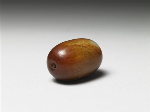 玉質,外型橢圓如棗,一端深刻一圈,並將圈中心玉略磨整如棗蒂,另端則淺凹,全器受染呈現深紅色貌,使整器有如一熟成而而外皮由青變紅的棗子。
