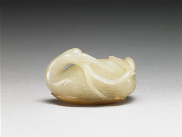 玉質,雕為一鵝,鵝曲頸回首、口啣枝梗,並利用玉色黃褐處琢為鵝所臥之荷葉,是為巧妙利用玉色的製作。本器與其他三件玉器故玉4532、故玉4533、故玉4535,同儲於一委角方形木盒中。