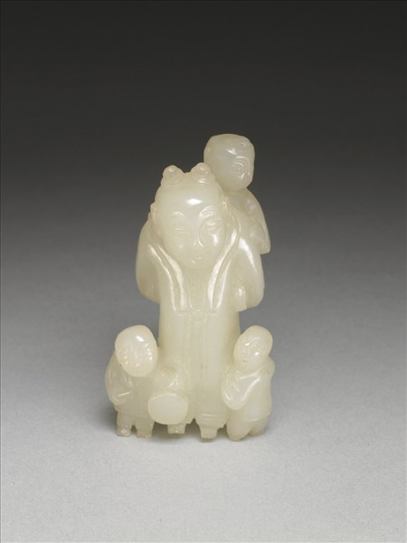 玉質,雕一人居中站立背一小兒,左右兩側各有一小兒緊挨在身旁,居中背人者身形最大,但頭上猶有雙髻,應該也是兒童,所以,整件玉器的雕製,是表現兒童間長幼的遊戲與相互照顧、依靠。本器與其他三件玉器故玉4532-4534,同儲於一委角方形木盒中。