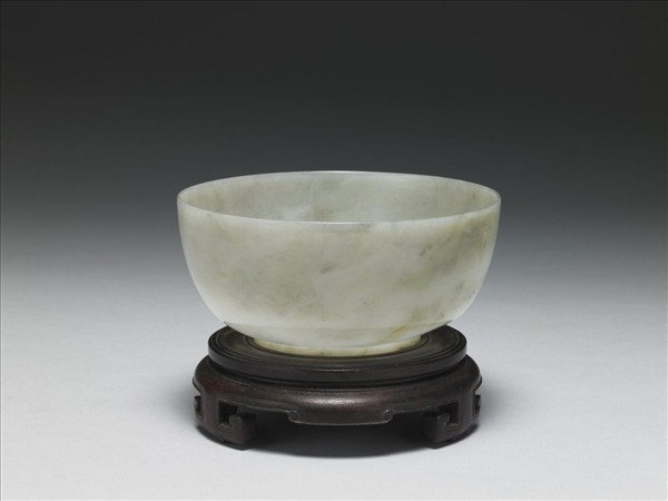 白玉沁灰,部分沁褐,玉質溫潤。圓直口,深弧壁,平底,圈足。全器光素無紋。附如意雲形足圓形木座一只。