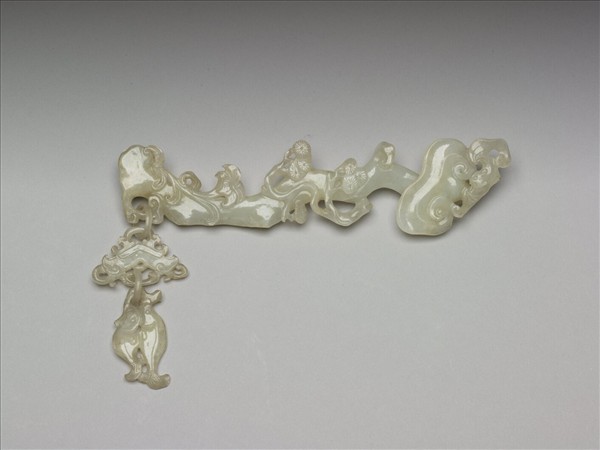 玉靈芝如意,首端鏤雕一蝙蝠,芝柄彎曲,中間附生松樹,尾部生水仙及小芝;趾端雕活環一,套接一磬,又一活環連接下方的雙魚。