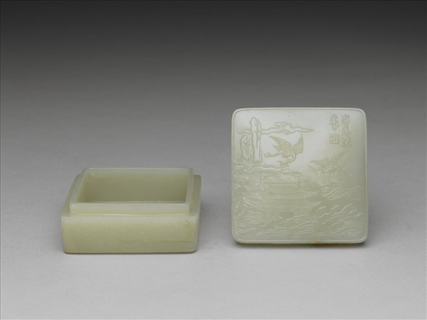 玉質,略泛灰青,質瑩潔。方盒,蓋面微鼓起,直壁,底平凹入。蓋面淺浮雕海波中的樓宇、遠山、浮雲,二仙鶴各銜一籌飛來。紋線俱作細陽文勾勒輪廓,有如白描圖畫,琢碾工緻。右上角草書陽文:「海屋添籌」。並一白文篆字方印︰「子岡」。四壁均浮雕山茶花,採蓋壁與盒壁花紋相銜接的過枝形式,甚巧妙。器底有朱文篆字方印︰「珍玩」。陸子岡是明末江南蘇州地區著名的離玉工匠,並與當時的文人高士相過從,方志、筆記中記其作品多為文房用品如水注、印泥盒之類,且善作復古的開案或器形。傳世所見子岡款器,則多為繪畫式的構圖、行草書的詩文題識、及刀刻陰文款字,但雕技工拙參差,款字書風不一。本器為明晚期至清早期蘇州玉雕的精工之作。