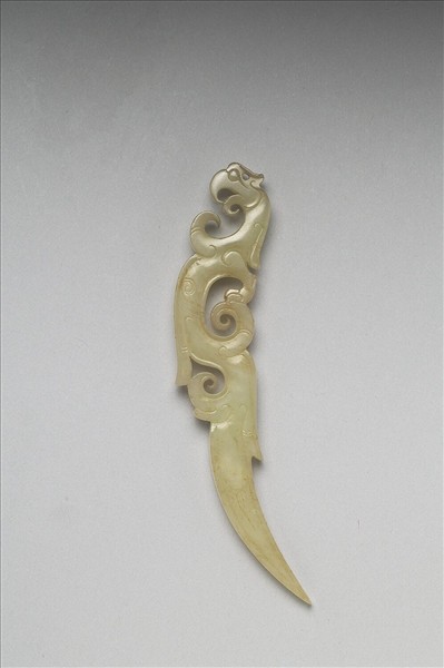 此件玉觿與故玉4114似為成對器,玉觿色純而溫潤,刻成側身鳳鳥形,尾端尖而卷,眼、耳間穿一小孔,便於懸掛、佩帶。全器輕俏婉約,器身外緣亦陰線刻出外廓,刻工細膩,與故玉4114玉龍佩之風格一致。