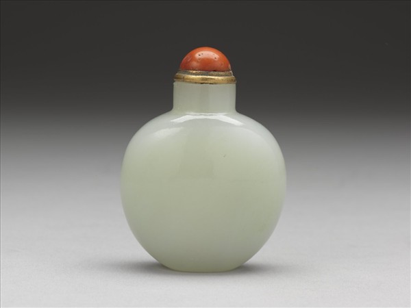 直口,削肩,壺身扁平形,平底,圈足內凹。帶銅嵌珊瑚蓋及牙匙。器身光素無紋。玉質溫潤,質地細密,展現簡約質樸的風格。