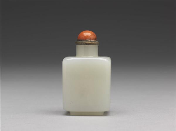 直口,短頸,方肩,短圈足,壺身方正工整。帶銅嵌珊瑚蓋及牙匙。器身光素無紋。玉質溫潤,質地細密,展現簡約質樸的風格。鼻煙壺為盛放鼻煙的專用器具,隨著吸聞鼻煙習俗的興起應運而生的,是中國古代文物中的一個獨特品種。