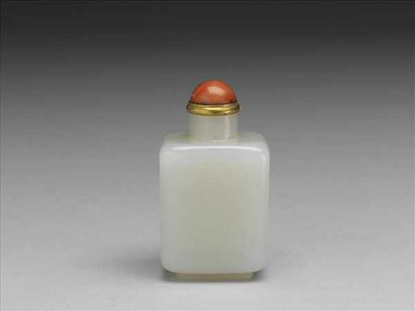 直口,短頸,方肩,短圈足,壺身方正工整。帶銅嵌珊瑚蓋及牙匙。器身光素無紋。玉質溫潤,質地細密,展現簡約質樸的風格。鼻煙壺為盛放鼻煙的專用器具,隨著吸聞鼻煙習俗的興起應運而生的,是中國古代文物中的一個獨特品種。