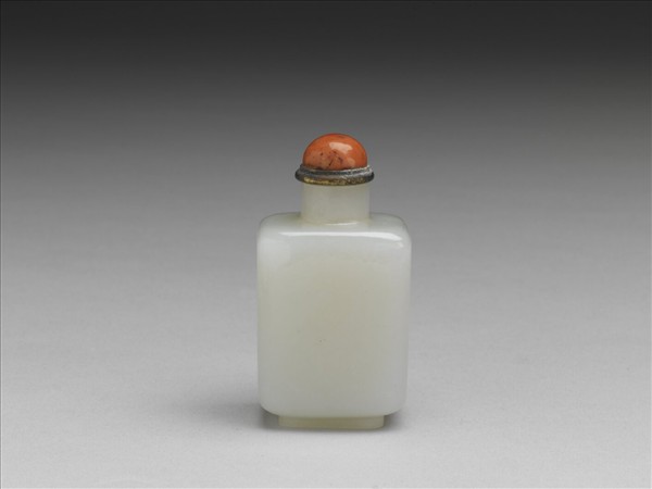 直口,短頸,方肩,短圈足,壺身方正工整。帶銅嵌珊瑚蓋及牙匙。器身光素無紋。玉質溫潤,質地細密,展現簡約質樸的風格。鼻煙壺為盛放鼻煙的專用器具,隨著吸聞鼻煙習俗的興起應運而生的,是中國古代文物中的一個獨特品種。