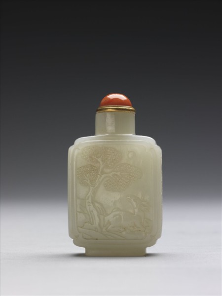 直口,短頸,方肩,短圈足,壺身方正工整。帶銅嵌珊瑚蓋及牙匙。器身一面浮雕羊隻臥坐回首於松樹下的圖像,圖像有寓意天賜恩物的涵意。另一面刻有字「受天百祿」。玉質溫潤,質地細密。