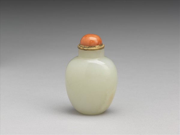 直口,削肩,橢圓壺身扁平形,平底。帶珊瑚蓋及牙匙。器身光素無紋。玉質溫潤,質地細密,展現簡約質樸的風格。此套煙壺一組5個(故玉4793-4797),並附有黃色錦地紋盒,底座為雕花木架。鼻煙壺為盛放鼻煙的專用器具,隨著吸聞鼻煙習俗的興起應運而生的,是中國古代文物中的一個獨特品種。