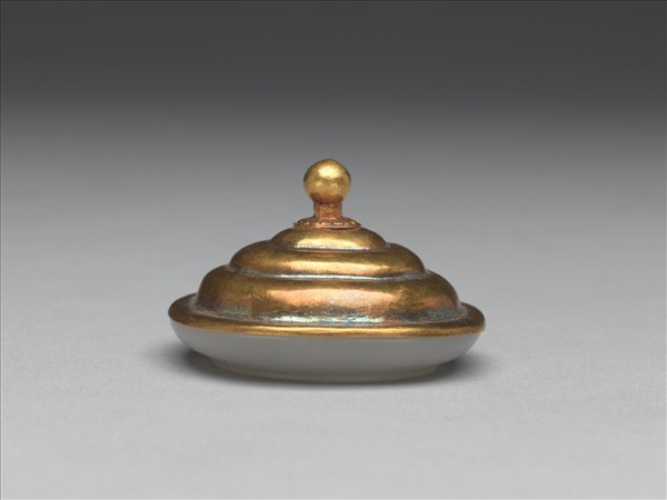 與故雜1129〈瑪瑙巧雕五福萬代鼻煙壺〉為一組,玉橢圓鼻煙碟附有銅蓋。